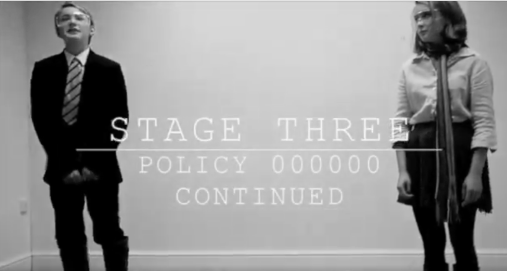 About: A semi-immersive piece of theatre combining film and live performance, exploring how as a society we willingly allow ourselves to be controlled by hidden bureaucratic systems.